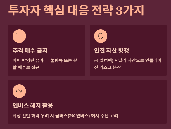 3. 인버스 활용: 시장 전체가 유가 부담으로 빠질 것 같다면 **곱버스(2X 인버스)**를 헤지 수단으로 고려해 볼 수 있습니다.