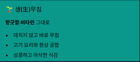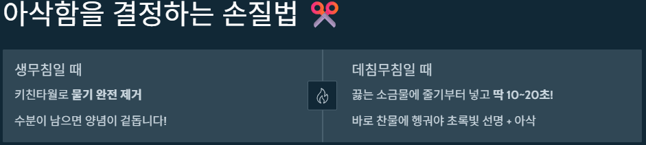 - 생무침일 때: 물기를 최대한 제거하는 것이 핵심입니다. 키친타월로 가볍게 눌러주면 양념이 겉돌지 않습니다.