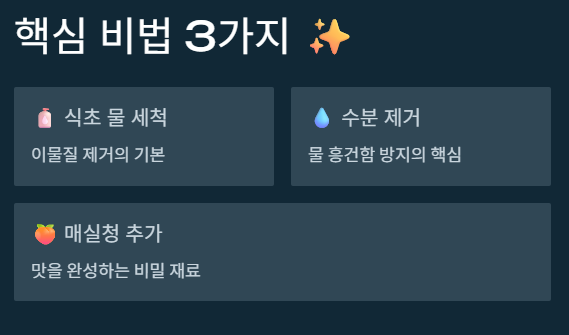 - 해피대디의 비법: 여기에 매실청 1큰술을 더해보세요. 식초의 날카로운 신맛을 잡아주면서 고급스러운 단맛이 살아납니다.