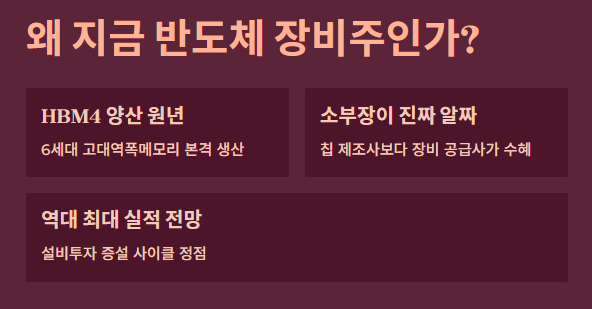 코스피 6,100선 시대, 그 주인공은 단연 반도체입니다. 하지만 "삼성전자를 살까, SK하이닉스를 살까?" 고민하는 사이, 진짜 알짜 수익은 이들에게 장비를 공급하는 '소부장(소재·부품·장비)' 기업들이 가져가고 있습니다. 특히 2026년은 HBM4(6세대 고대역폭메모리) 양산이 본격화되면서 반도체 장비주의 가치가 재평가되는 원년입니다.
