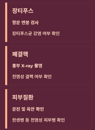 2. 검사항목: 폐결핵(엑스레이), 장티푸스(항문 면봉), 피부질환입니다.