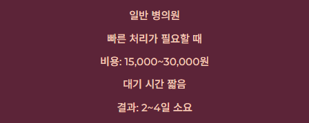 • 일반 병원: 15,000원 ~ 30,000원 (대기 시간이 적고 결과가 빠름)