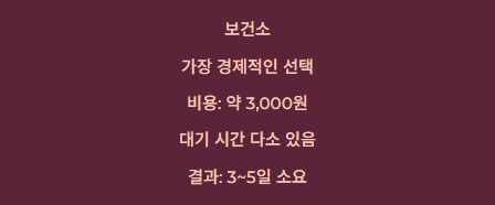 • 경제성 중심(보건소): 비용이 매우 저렴(3천 원대)합니다. 하지만 방문객이 많아 대기가 길 수 있고, 발급까지 며칠이 소요됩니다.