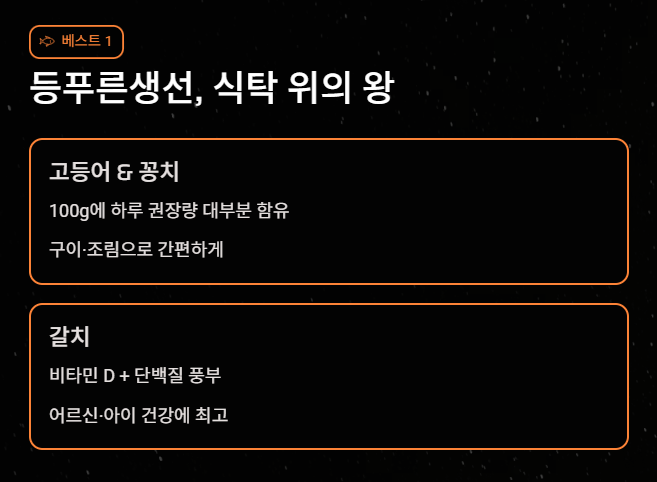 - 고등어 & 꽁치: 구이나 조림으로 자주 먹는 고등어 100g에는 성인 하루 권장량의 상당 부분이 들어있습니다.