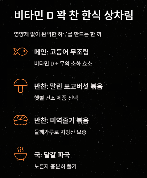 - 반찬: 들깨가루를 넣은 미역줄기 볶음 (비타민 D 흡수를 돕는 지방산 함유)