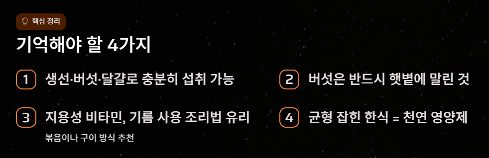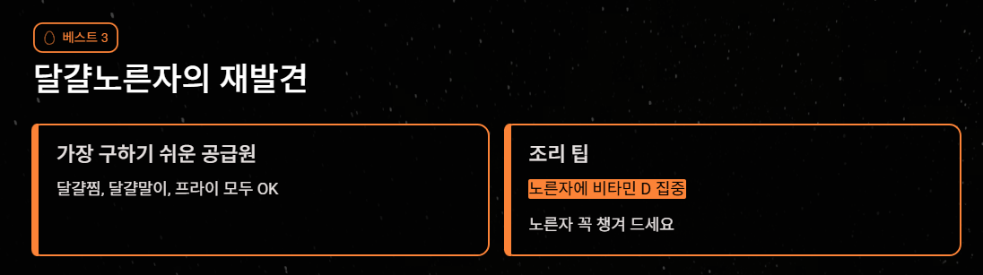 - 조리팁: 달걀찜, 달걀말이, 프라이 등 어떤 형태든 좋습니다. 다만 비타민 D는 노른자에 집중되어 있으므로 노른자를 꼭 챙겨 드세요.