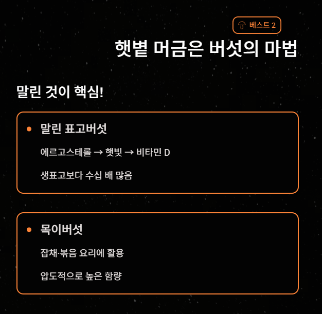 버섯은 식물성 비타민 D의 핵심 급원입니다. 단, **'햇볕에 말린 것'**이어야 합니다.