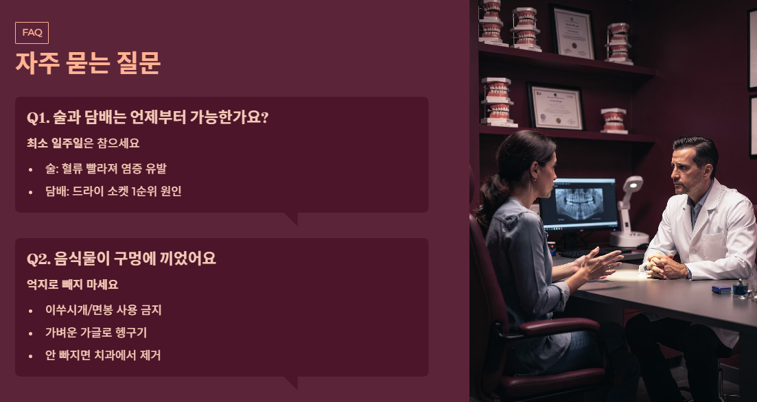 Q1. 술과 담배는 도대체 언제부터 가능한가요? A. 상처가 안정되는 최소 일주일은 참으셔야 합니다. 술은 혈류를 빠르게 해 염증을 유발하고, 담배는 드라이 소켓의 1순위 원인입니다.