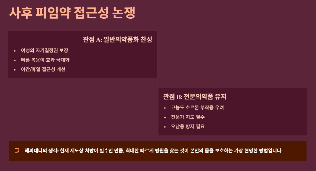 - 고농도 호르몬제가 여성의 몸에 미치는 부작용(호르몬 교란, 혈전 위험 등)이 상당하므로 전문가의 지도가 필수적이라는 주장입니다. 또한, 사후 피임약이 일반 피임법을 대신하는 수단으로 오남용될 경우 여성 건강에 심각한 해를 끼칠 수 있다는 우려를 근거로 합니다.