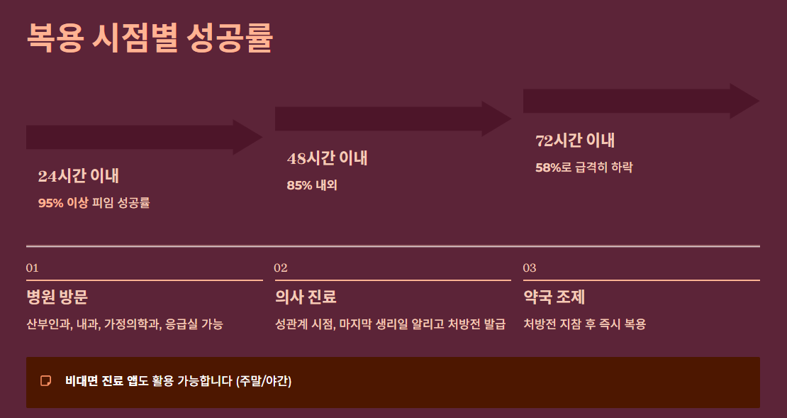 - 골든타임: 성관계 후 24시간 이내 복용이 가장 효과적이며, 늦어도 72시간(일부 약제 120시간) 내에는 복용해야 합니다.