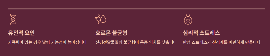 정확한 원인은 아직 밝혀지지 않았지만, 전문가들은 **'중추신경계의 오류'**를 가장 큰 원인으로 봅니다. 근육이나 관절 자체에 염증이 있는 것이 아니라, 뇌가 통증 신호를 처리하는 과정에서 작은 자극도 '아주 큰 고통'으로 잘못 해석하는 것입니다. 유전적 요인, 호르몬 불균형, 심리적 스트레스가 복합적으로 작용합니다.