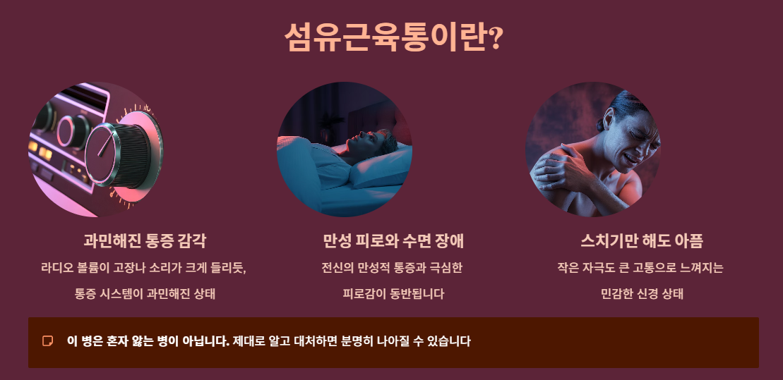 섬유근육통은 전신에 걸친 만성적인 통증과 피로감, 수면 장애를 동반하는 질환입니다. 마치 라디오 볼륨이 고장 나 소리가 크게 들리는 것처럼, 우리 몸의 통증 감각 시스템이 과민해져서 스치기만 해도 아픔을 느끼는 상태라고 보시면 됩니다.