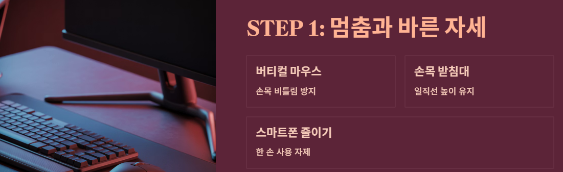 STEP 1: '멈춤'과 '바른 자세' (가장 중요!) 가장 좋은 치료는 휴식입니다. 하지만 쉴 수 없다면 환경을 바꿔야 합니다.