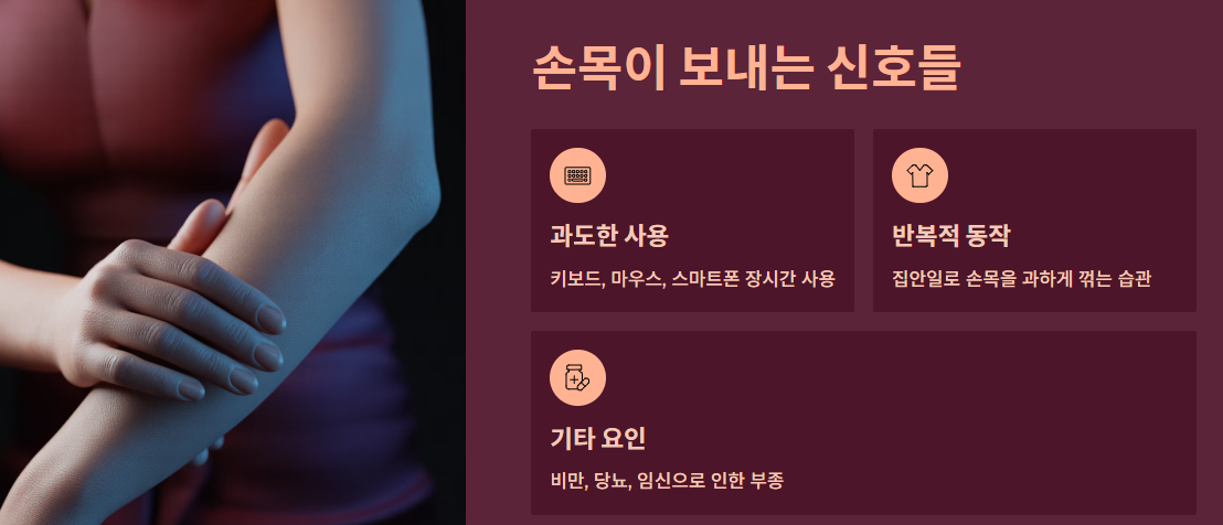 - 생활 습관: 집안일(걸레 짜기 등)로 손목을 과하게 꺾는 동작 반복.