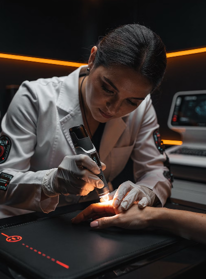 - 육안 및 더모스코피 검사: 특수 돋보기를 통해 색소의 패턴을 정밀하게 관찰합니다. 90% 이상의 양성 여부를 여기서 가릴 수 있습니다.