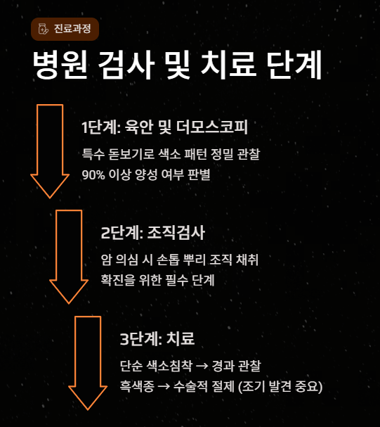 - 치료: 단순 색소 침착은 경과 관찰만 하면 되지만, 흑색종으로 판명될 경우 수술적 절제가 필요합니다. 초기라면 손톱 부위만 제거하지만, 진행된 경우 마디를 절단해야 할 수도 있으므로 조기 발견이 무엇보다 중요합니다.