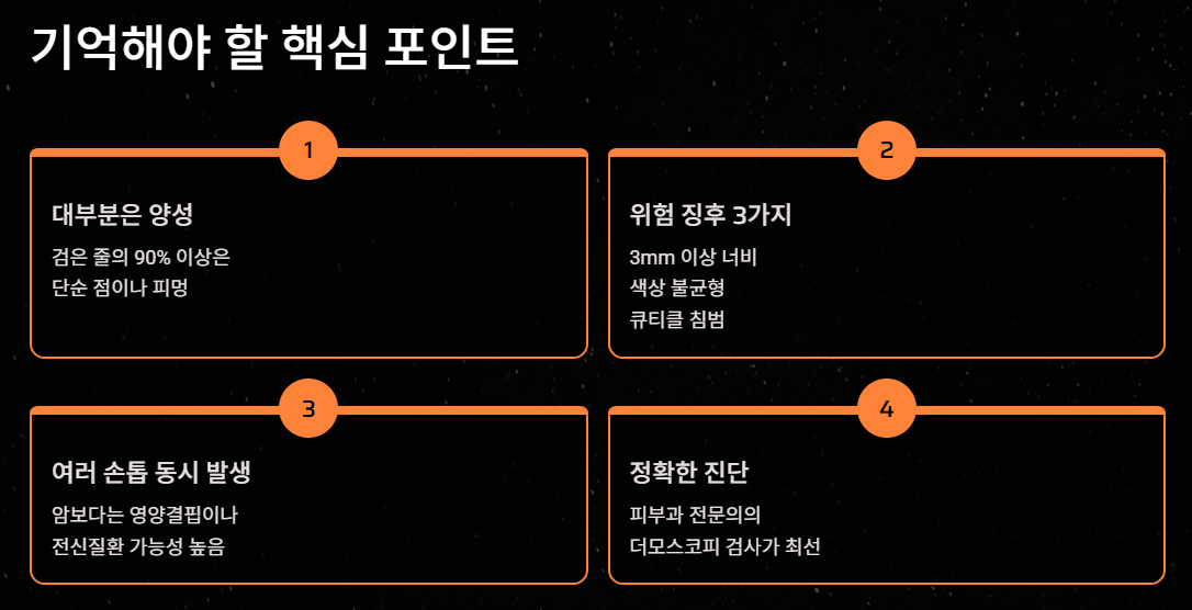 흑색종은 피부암 중에서도 전이가 빠르고 치명적입니다. 손톱 흑색종은 초기 통증이 전혀 없기 때문에 치료 시기를 놓치기 쉽습니다. "설마 내가 암이겠어?"라는 안일한 생각보다는, 위에서 언급한 위험 징후가 하나라도 보인다면 피부과 전문의를 찾아 '더모스코피(Dermoscopy)' 검사를 받는 것이 가장 안전한 선택입니다.