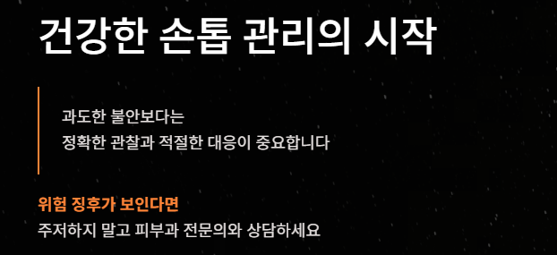 - Extension (확장): 가장 중요한 징후인 **'허친슨 징후(Hutchinson’s sign)'**입니다. 검은 색소가 손톱을 넘어 주변 피부나 큐티클까지 번져 나간다면 즉시 병원을 가야 합니다.