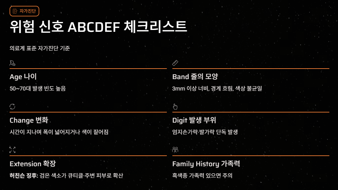 모든 검은 줄이 위험한 것은 아닙니다. 의료계에서 통용되는 ABCDEF 법칙을 통해 자가 진단을 해보세요.