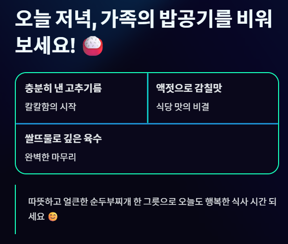 순두부찌개의 핵심은 '충분히 낸 고추기름' 과 '액젓을 활용한 감칠맛' 입니다. 복잡한 조리 과정 없이도 오늘 알려드린 단계만 지킨다면 여러분의 식탁에도 식당 수준의 순두부찌개가 올라갈 수 있습니다. 오늘 저녁, 따뜻하고 얼큰한 순두부찌개로 행복한 식사 시간을 만들어 보세요!