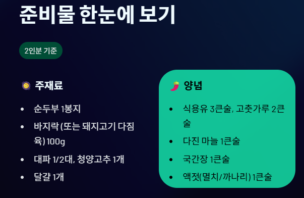 - 주재료: 순두부 1봉지, 바지락(또는 돼지고기 다짐육) 100g, 대파 1/2대, 청양고추 1개, 달걀 1개