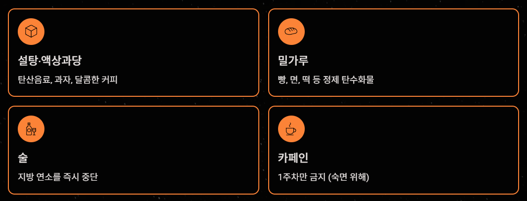 - 카페인(1주차만): 1주차에는 숙면과 생체 리듬을 위해 커피를 끊어야 합니다.