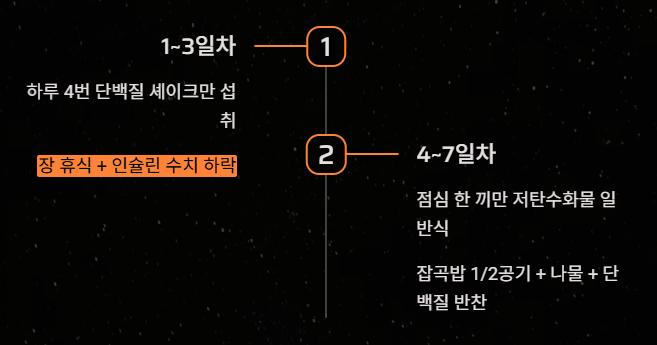- 1~3일차: 하루 4번 단백질 셰이크만 섭취합니다. 장을 쉬게 하고 인슐린 수치를 떨어뜨리는 과정입니다.