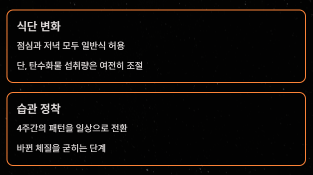 - 1주차(리부팅) - 2주차(감량) - 3주차(가속) - 4주차(안착) 단계를 따릅니다.