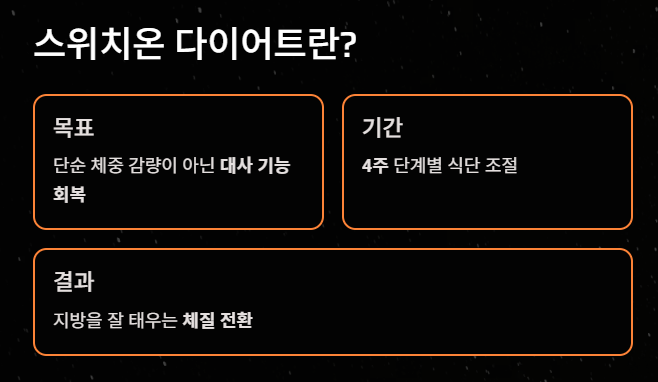 - 스위치온 다이어트는 4주 동안 망가진 대사 기능을 회복하는 프로그램입니다.