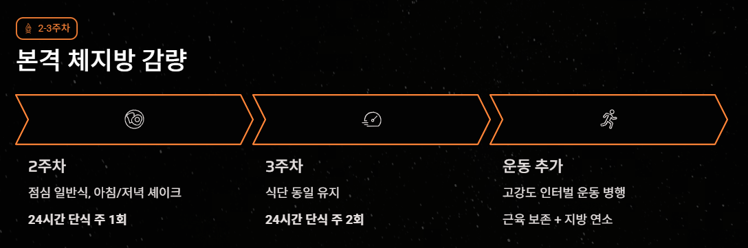 - 식단: 2주차와 동일하게 유지하되, 24시간 단식을 주 2회로 늘립니다.