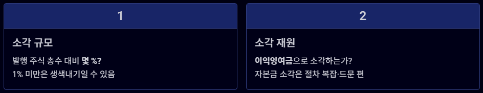 - 소각 재원 확인: 이익잉여금으로 소각하는가? (자본금 소각은 절차가 복잡하고 드문 편)