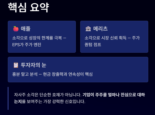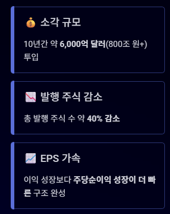 - 실행 방식: 애플은 지난 10년간 약 6,000억 달러(한화 약 800조 원 이상) 규모의 자사주를 사서 소각했습니다.