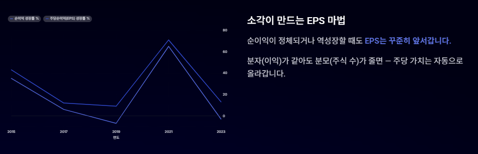 - 결과: 발행 주식 수가 약 40%가량 줄어들었습니다. 기업의 전체 이익 성장 속도보다 '주당순이익(EPS)' 성장 속도가 훨씬 빨라졌고, 이는 곧 주가 상승의 강력한 엔진이 되었습니다.