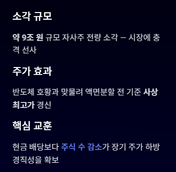- 내용: 약 9조 원 규모의 자사주를 전량 소각하며 시장에 충격을 주었습니다.