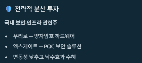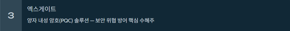 - 엑스게이트: 양자 내성 암호(PQC) 솔루션을 통해 양자컴퓨터 시대의 보안 위협을 방어하는 핵심 수혜주입니다.