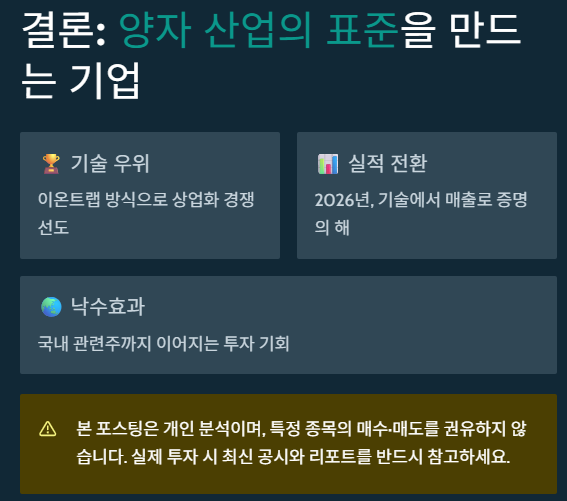 아이온큐는 단순한 테마주를 넘어 '양자 산업의 표준' 을 만들어가고 있습니다. 2026년은 기술적 신비주의를 벗고 산업적 실용성을 입증하는 해가 될 것입니다.