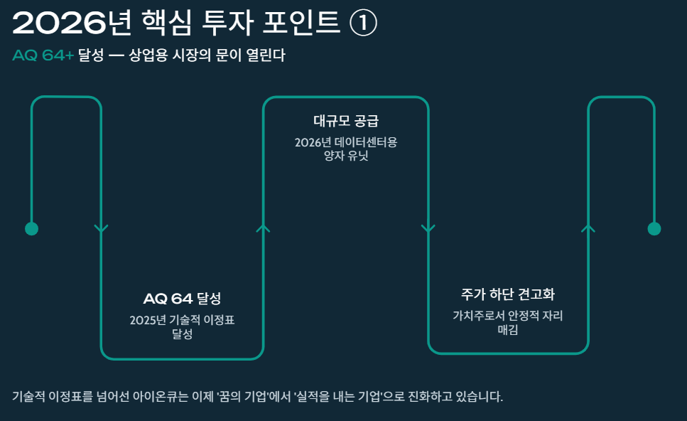 아이온큐는 2025년을 기점으로 AQ 64 이상의 성능을 구현하며 상업용 양자컴퓨터 시장을 열었습니다. 2026년에는 대규모 데이터센터에 양자 유닛을 공급하는 단계에 진입할 것으로 보여, 주가의 하단이 견고해지는 '가치주'로서의 면모도 갖추기 시작할 전망입니다.