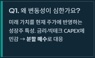 A1. 성장주 특성상 미래 가치를 당겨오기 때문입니다. 금리 상황과 빅테크 기업들의 설비투자(CAPEX) 규모에 민감하게 반응하므로 분할 매수로 대응하는 것이 현명합니다.