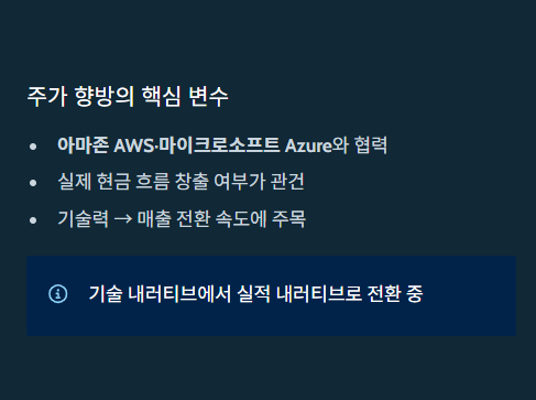 과거에는 기술력만으로 주가가 움직였다면, 이제는 매출과 파트너십이 중요합니다. 아마존(AWS), 마이크로소프트(Azure) 등 클라우드 기업과의 협력이 실제 얼마만큼의 현금 흐름을 만들어내느냐가 주가 향방의 핵심이라는 시각입니다.