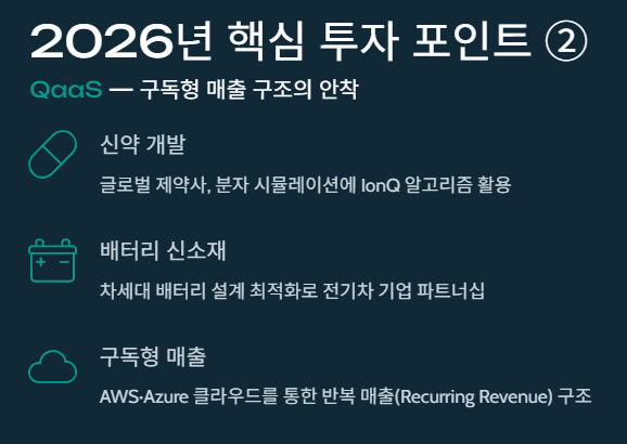 단순히 컴퓨터를 파는 것이 아니라 '양자 컴퓨팅 서비스(QaaS)' 모델이 안착하고 있습니다. 신약 개발, 배터리 신소재 설계 등에서 글로벌 대기업들이 아이온큐의 알고리즘을 사용함에 따라 구독형 매출이 발생하는 구조가 정착되고 있습니다.
