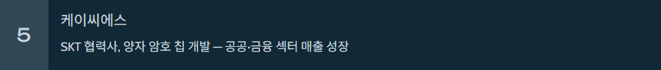 - 케이씨에스: SK텔레콤과 협력하여 양자 암호 칩을 개발, 보안이 중요한 공공 및 금융 섹터에서 매출 성장이 기대됩니다.