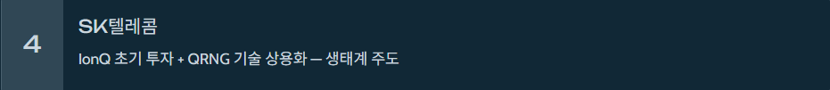 - SK텔레콤: 아이온큐에 초기 투자했을 뿐만 아니라, 양자난수발생(QRNG) 기술을 상용화하며 생태계를 주도하고 있습니다.
