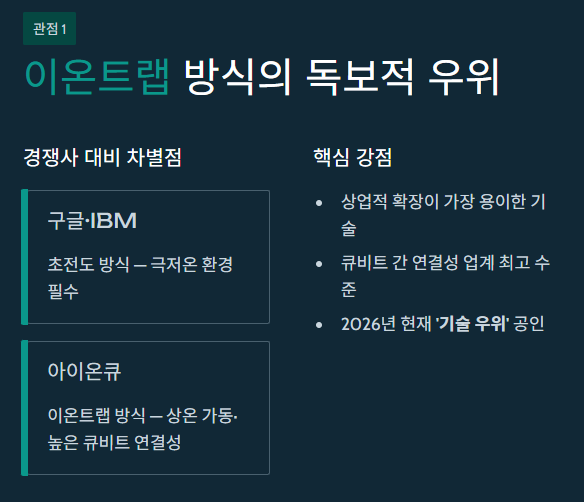 구글이나 IBM이 선택한 초전도 방식과 달리, 아이온큐는 '이온트랩(Ion Trap)' 방식을 사용합니다. 상온 가동이 비교적 쉽고 큐비트의 연결성이 뛰어나다는 장점이 있죠. 2026년 현재, 상업적 확장이 가장 용이한 기술로 평가받으며 '기술 우위'를 점하고 있다는 시각입니다.