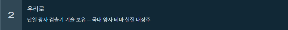 - 우리로: 양자암호 통신의 핵심인 단일 광자 검출기 기술을 보유하여 국내 양자 테마의 실질적인 대장주 역할을 합니다.