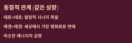 "비슷한 에너지를 가진 사람끼리 만나야 시너지가 난다." 테토끼리 만나면 열정적인 시너지를, 에겐끼리 만나면 세상에서 가장 평화롭고 따뜻한 연애를 할 수 있다는 시각입니다.