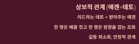 "서로 다른 자석이 끌리듯, 리드하는 테토와 받아주는 에겐이 만날 때 가장 안정적이다." 한 명은 배를 젓고 한 명은 방향을 잡는 형태라 갈등이 적고 조화롭다는 주장입니다.