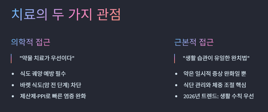 역류성 식도염이 심할 경우 식도 궤양이나 '바렛 식도'와 같은 암 전 단계로 발전할 수 있습니다. 따라서 제산제나 위산분비억제제(PPI)를 통해 우선적으로 염증을 가라앉히는 것이 가장 안전하고 빠른 길이라는 시각입니다.