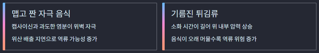 캡사이신이나 과도한 염분은 위벽을 자극하고 위산 배출을 지연시켜 역류 가능성을 높입니다.