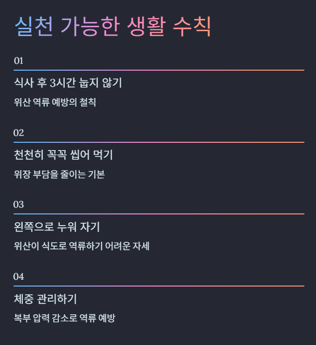 약은 일시적인 증상 완화일 뿐, 먹고 바로 눕는 습관이나 야식 문화를 바꾸지 않으면 반드시 재발합니다. 2026년 현재는 약물에 의존하기보다 식단 관리와 체중 조절, '왼쪽으로 누워 자기' 같은 생활 수칙 준수를 더 강조하는 추세입니다.