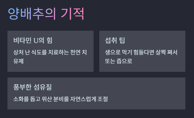 양배추 속 비타민 U는 위장 점막의 재생을 돕고 상처 난 식도를 치료하는 데 탁월합니다. 섬유질도 풍부해 소화를 돕고 위산 분비를 조절합니다.